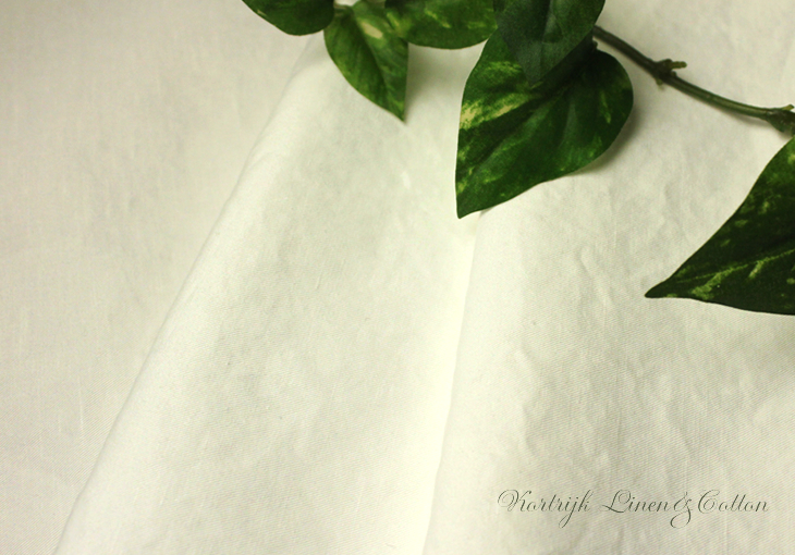 タテ糸にラミー(苧麻)とヨコ糸にリネン(亜麻)の糸を交織させて、シャリッとした肌触りと、ソフトな弾力が特長です。ラミー(苧麻)の原料のキナリはリネン(亜麻)と比べると青白い色味があるので、この交織の生地もオフ(晒して白にする)もキナリに影響されるので、青白気味のオフホワイトになります。