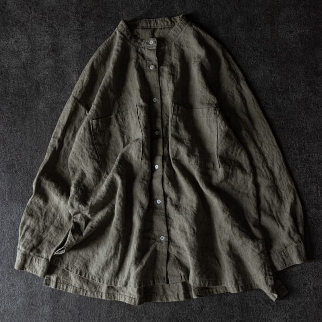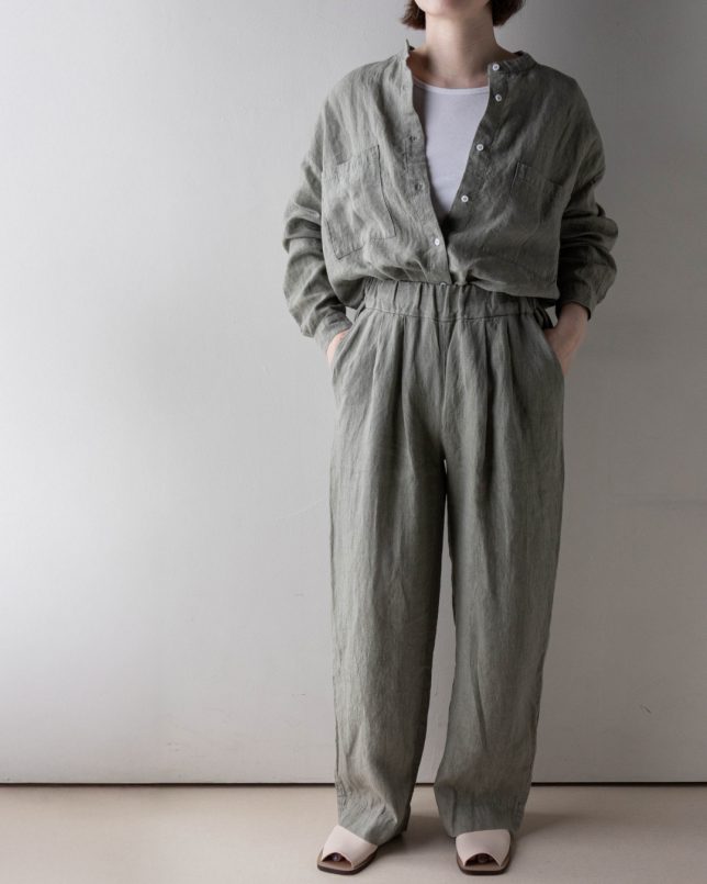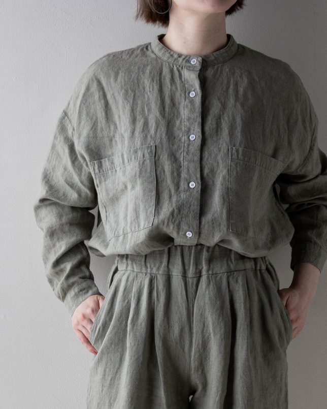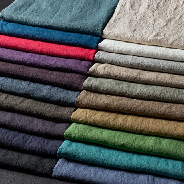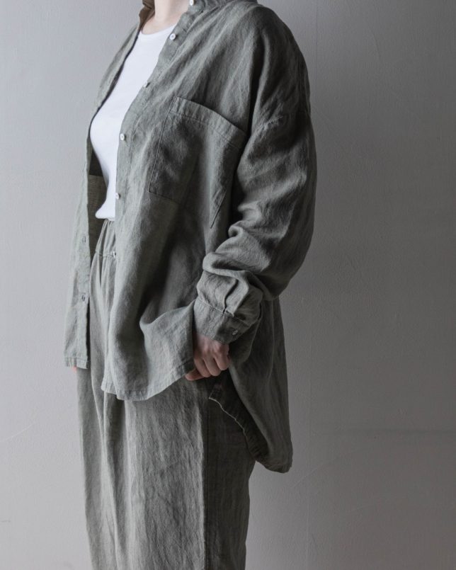 しっかりとした肉厚感と、しなやかな落ち感をあわせ持つ「洗いこまれた綾織りベルギーリネン25番手」は、秋らしい深みのあるカラーも豊富に揃っています。