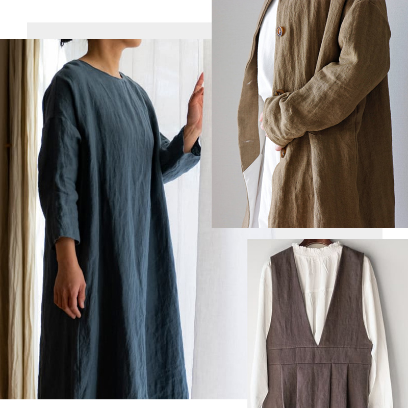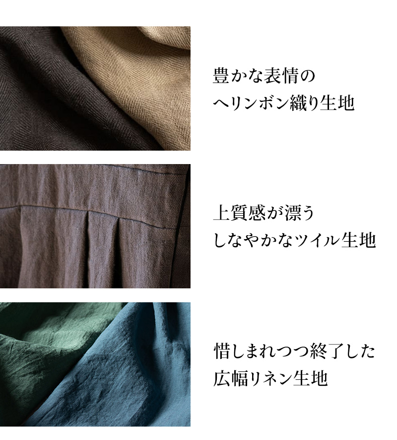 ベルギー産フラックスならではの細やかなキメ、しなやかな手触り、そして生地の森らしいくすみカラーと味わい深い風合いが魅力。