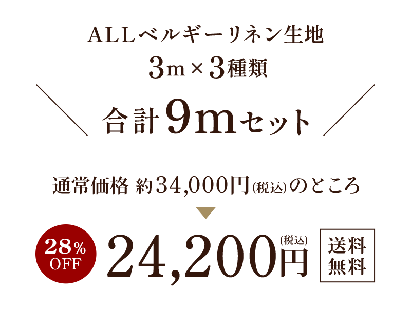 人気の「洗いこまれたベルギーリネン40番手」を中心に、ベルギーリネン100%の生地を“3種類×各3m(計9m)”セットしました。