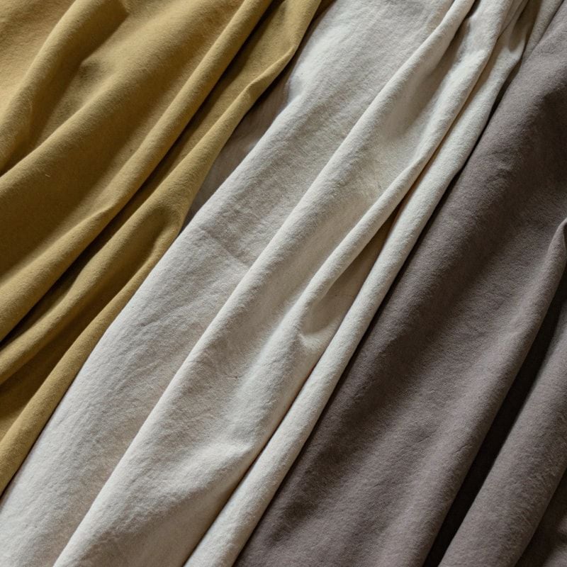 職人たちの技術で一つ一つ丁寧につくり上げます生地の森の生地は、素材の風合い作りや面(ツラ)の出し方、染色の技術において、地元浜松の地で、天然繊維を熟知した職人の熟練された技術と勘によってつくり出しております。