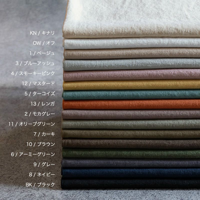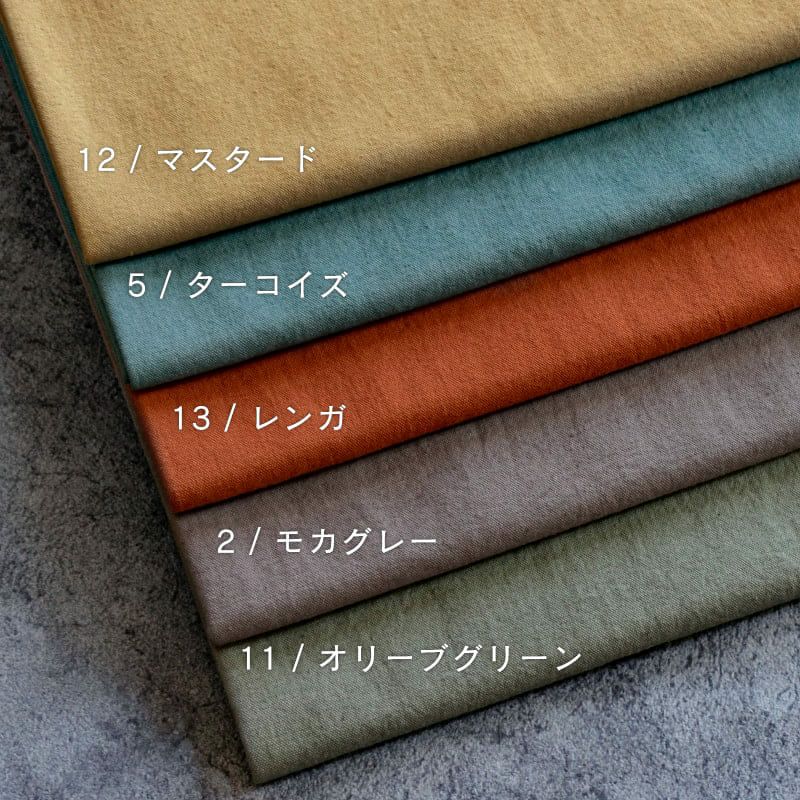 綿麻 ルーズオックスダメージダイド コットンリネン オックスフォード生地color:12/マスタード、5/ターコイズ、13/レンガ、2/モカグレー、11/オリーブグリーン