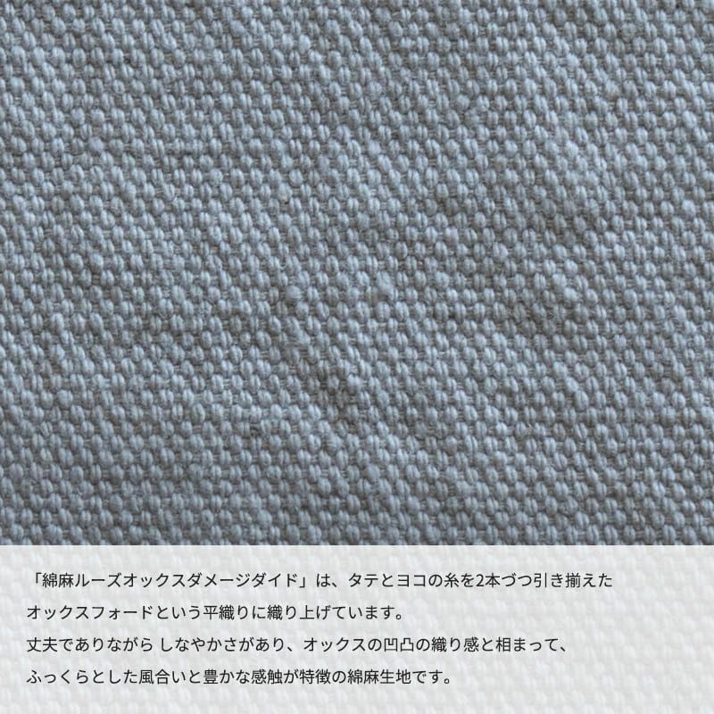 しなやかなふっくらとした風合いと豊かな感触「綿麻ルーズオックスダメージダイド」は、タテとヨコ2本づつの糸を引き揃えているため丈夫でありながら、しなやかさがあり、オックスの凹凸の織り感と相まって、ふっくらとした風合いと豊かな感触が特徴です。