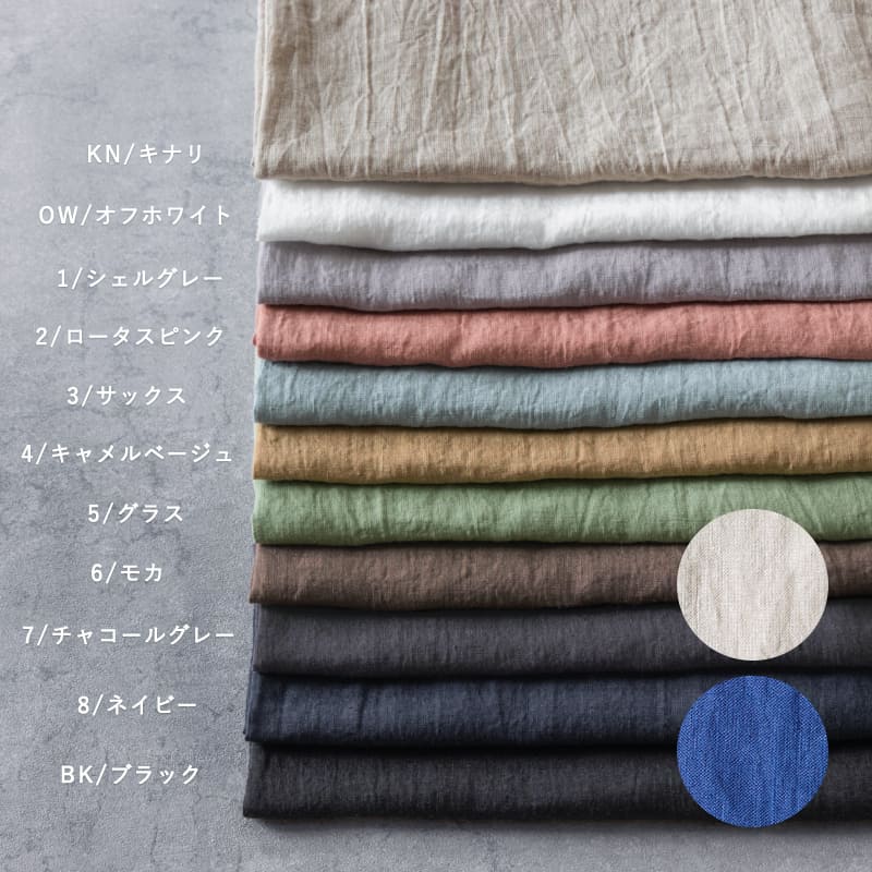 生地の森 洗いこまれたベルギーリネン異番手ローン リネン生地 麻 color:(左から)6/モカ、7/チャコールグレー、8/ネイビー、BK/ブラック