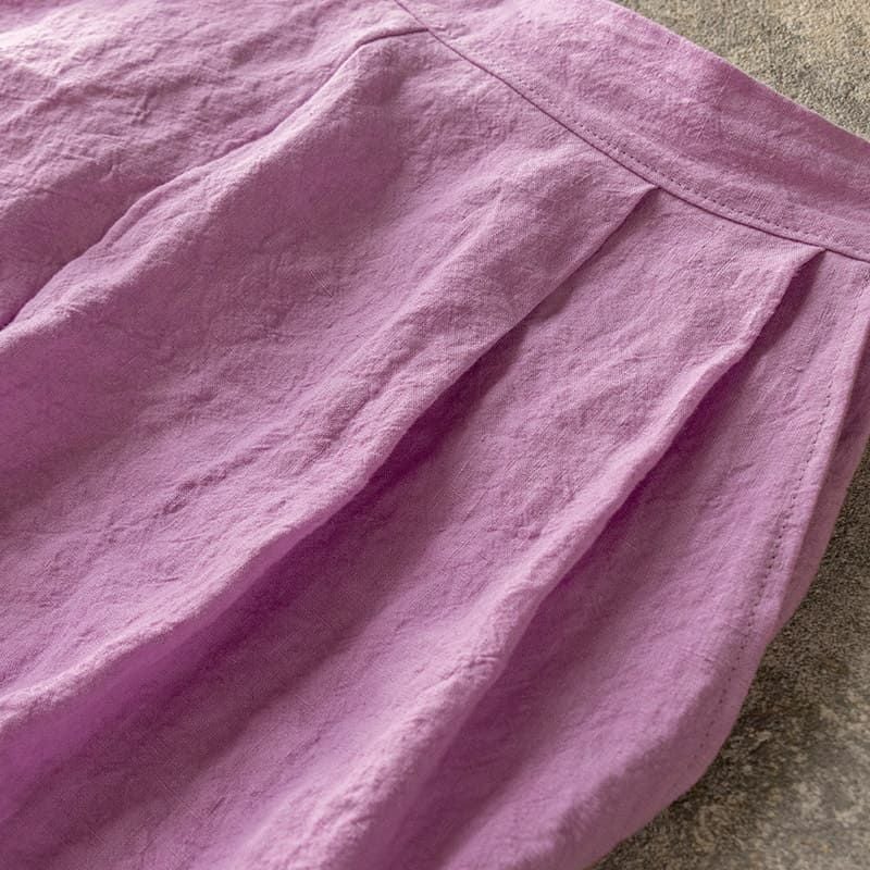 着るたびに実感するさらさらと心地よい肌触り無地染めフレンチリネン「リノクルール(Lino Couleur)」は、シワとシボが生み出すさらさらとした肌触りが特徴で、肌に触れるたびに涼やかさを感じさせます。しっかりとした厚みとハリコシのある生地は、型崩れしにくく、1枚でも安心して着用できる安心感を提供。