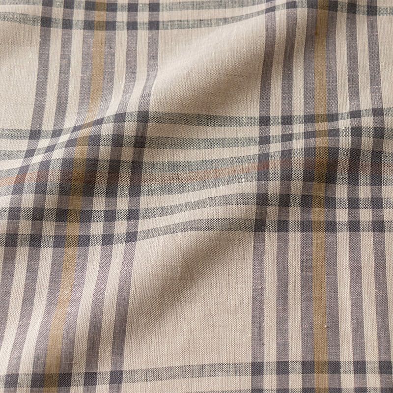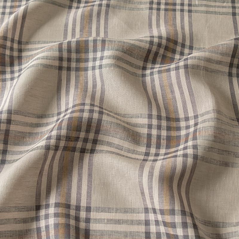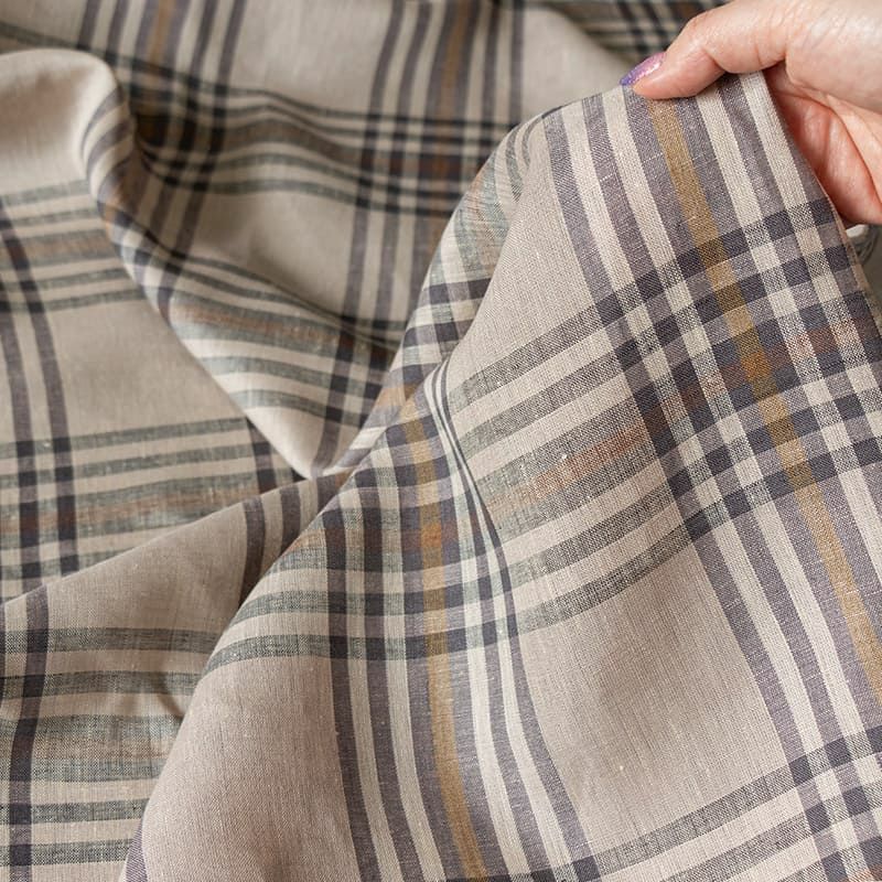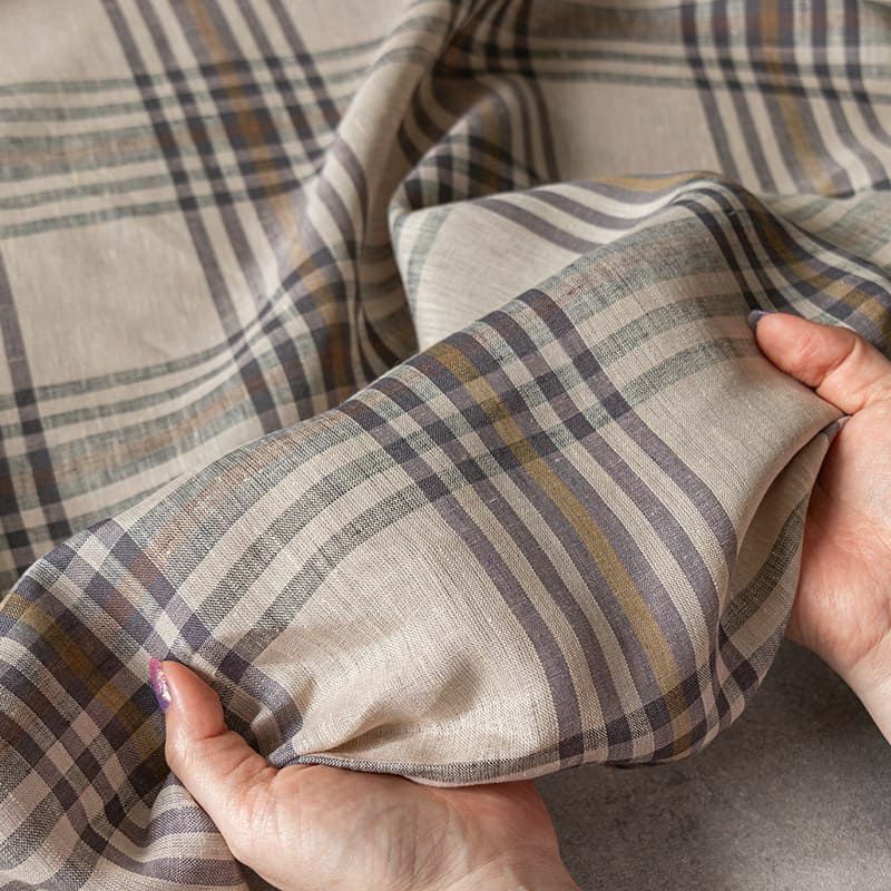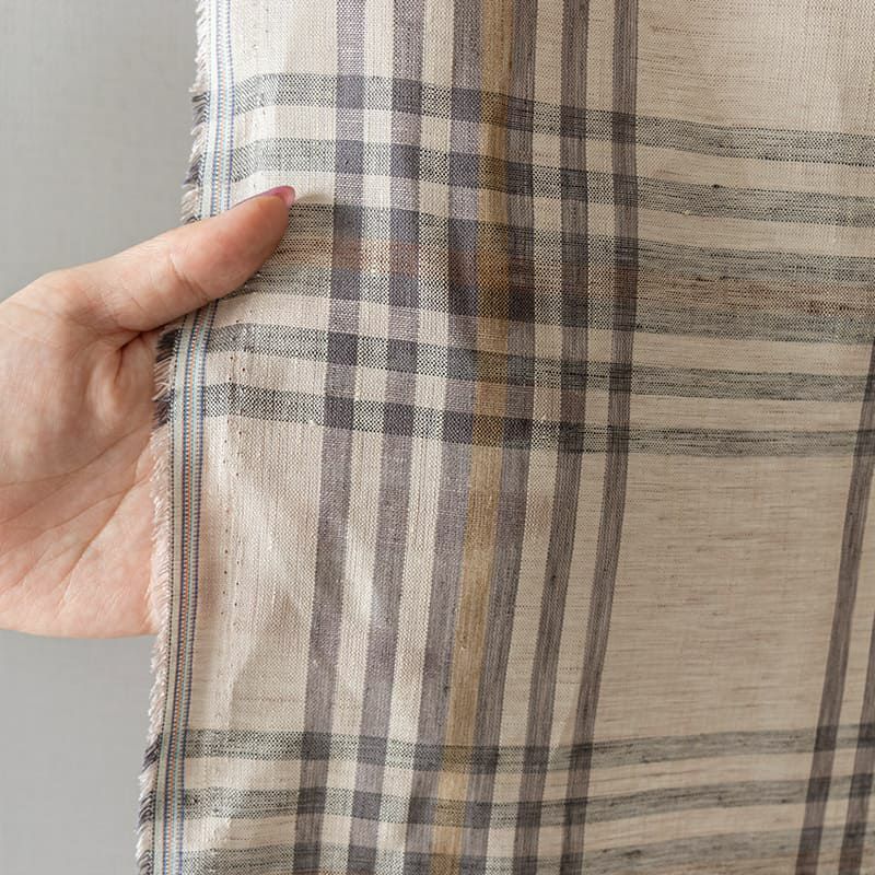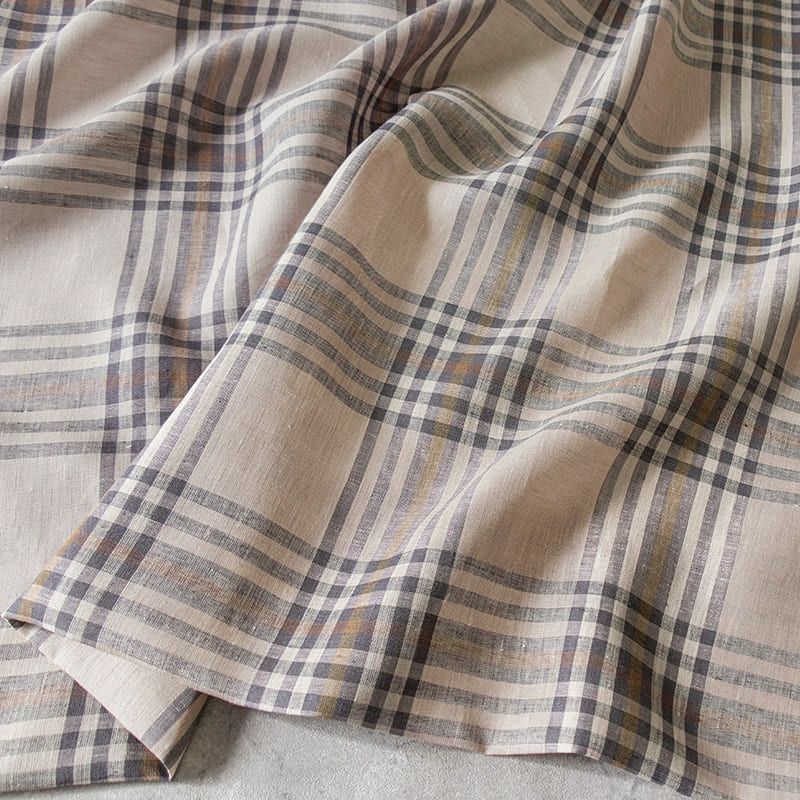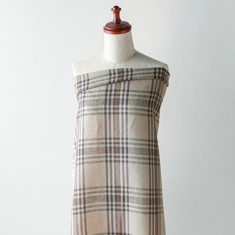 糸の前の段階から染める先染めのリネンのチェック生地 「先染め60番手リネンビッグチェック」は、糸にする前の段階から染めて紡績した60番手の先染めリネン糸を使い、平織りの大振りなチェック柄に織り上げたリネン100%のチェック生地です。 ハリコシの良い滑らかなツラ感 「先染め60番手リネンビッグチェック」は、さらっとした肌触りで、中肉薄ではありますがハリコシのある滑らかなツラ感仕上げてあります。 色褪せたような色調がモダンなリネンチェック 「先染め60番手リネンビッグチェック」のシャビーベージュは、色褪せたようなベージュを基調とした配色で、どんな色とも調和しやすい、洗練された落ち着いた雰囲気を漂わせます。 さらっとした素材感が涼し気、広幅でたっぷり楽しめます。 中肉薄でさらっとした素材感が涼し気な「先染め60番手リネンビッグチェック」は、生地幅(有効幅)で約138cmと広幅あり、シャツや羽織もの、ワンピースなどにたっぷりとお使いいただけます。品の良い大人っぽいモダンな雰囲気も作れますので、ぜひお試ください。 柄の大きさについて チェックの大きさ…約24.5cm×約22.5cm 加工上の特性上記画像のような所々の糸節やネップなど糸ムラが出ております。不良ではありませんので風合いとしてご理解ください。 カラーバリエーションについて「先染め60番手リネンビッグチェック」はアンティークグレーとシャビ―ベージュの2色展開です。 アンティークグレー アンティークグレーはこちら シャビーベージュ シャビーベージュはこちら 数量は0.5mの単位販売、個数1=0.5m、個数2=1m、個数3=1.5mと、0.5m単位で最大個数40=20mまでお求めいただけます。ぜひ身近なものにお役立てください。