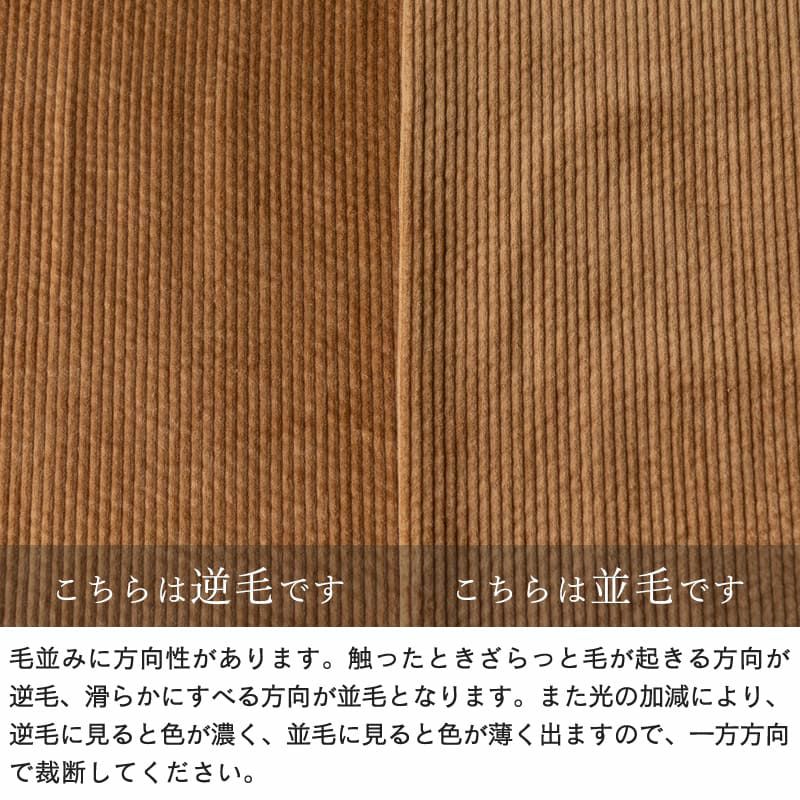 また光の加減により、逆毛に見ると色が濃く、並毛に見ると色が薄く出ますので、一方方向で裁断してください。