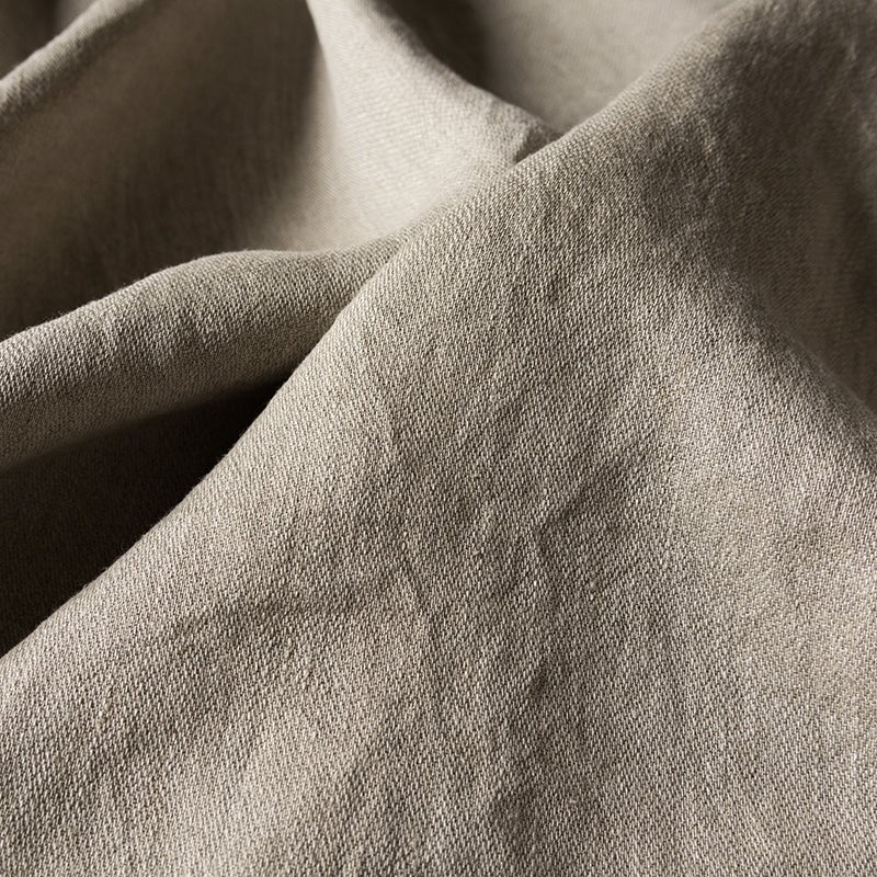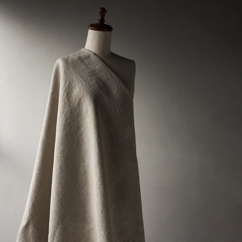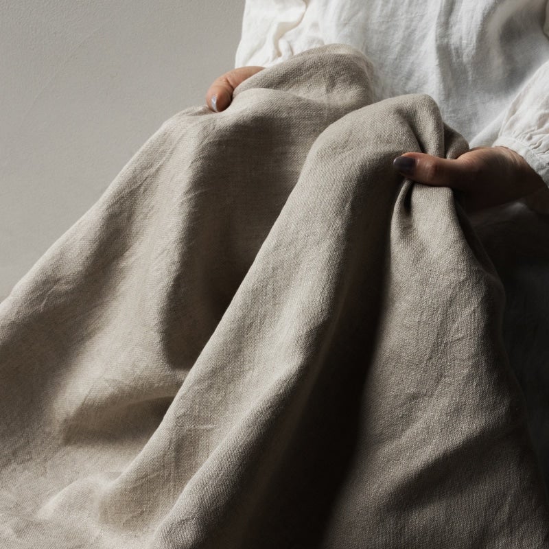 しっかりとした厚みと芯のある柔らかさ ベルギーリネンブロークンツイル25番手は、しっかりとした厚みとハリ感の中に柔らかさがあり、仕立てると自然なドレープが生まれ、生地が柔らかく流れながらも形を美しく保ちます。