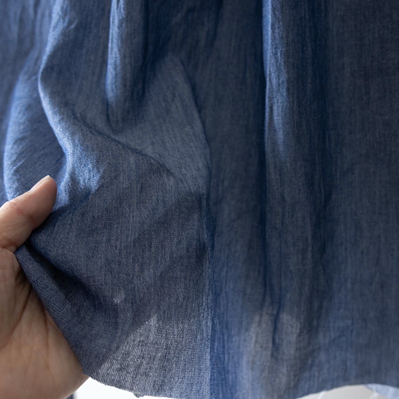 ローン生地に近い軽やかさで、デニムの表情を残しながら、ほんのりとしたシアー感を楽しめます。