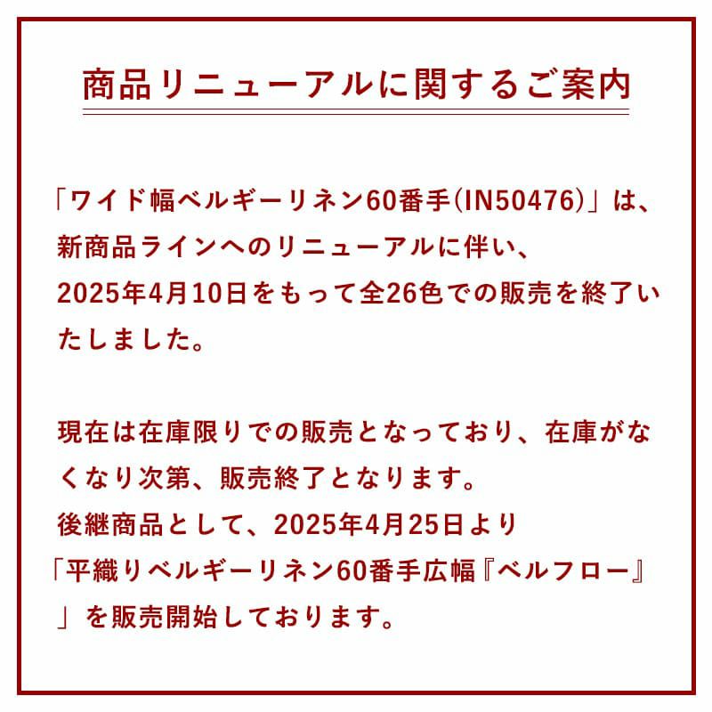 「ワイド幅ベルギーリネン60番手(IN50476)」は、 新商品ラインへのリニューアルに伴い、2025年4月10日をもって全26色での販売を終了いたしました。