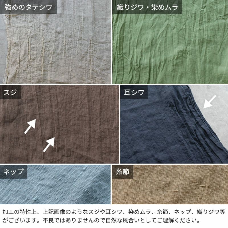 ・素材特有の糸節(太い線上のもの),ネップ(繊維のかたまり),カス(植物樹皮など色の粒),異原糸(色糸)の混入は避けられません。