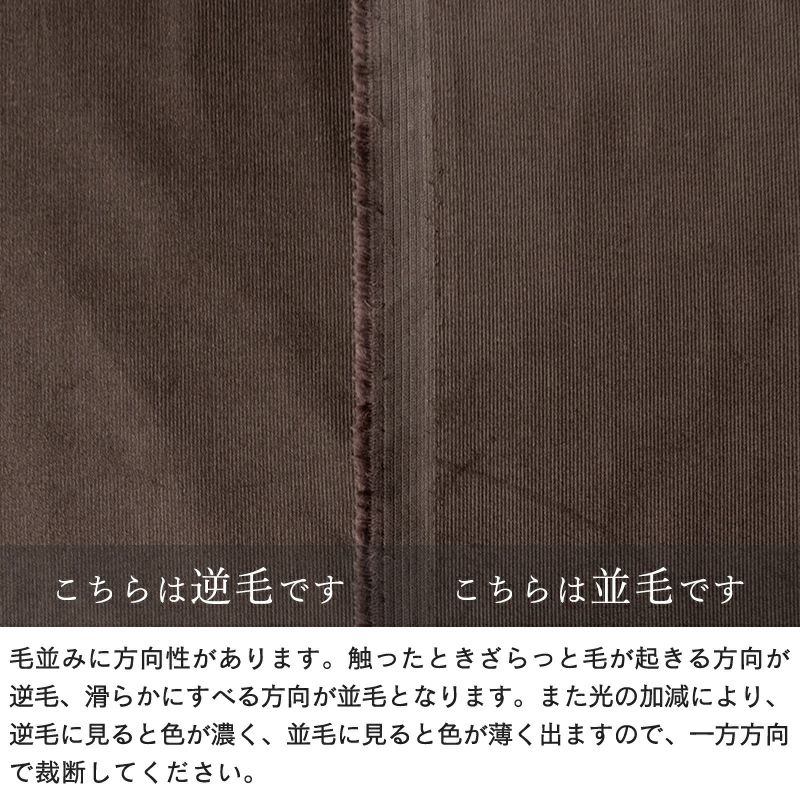 また光の加減により、逆毛に見ると色が濃く、並毛に見ると色が薄く出ますので、一方方向で裁断してください。