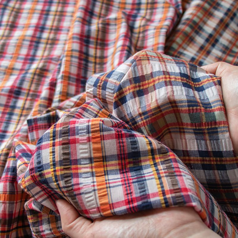 通気性と速乾性に優れ、さらりとした肌触り 「先染めT/Cヴィンテージサッカーチェック」のサッカーとは、収縮率の違うタテ糸を組み合わせて平織りし、仕上げに縮ませることで表面に複雑な凹凸感を出しており、