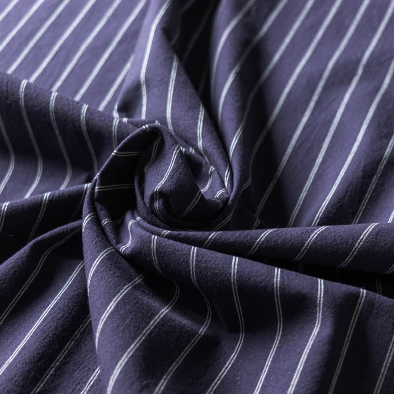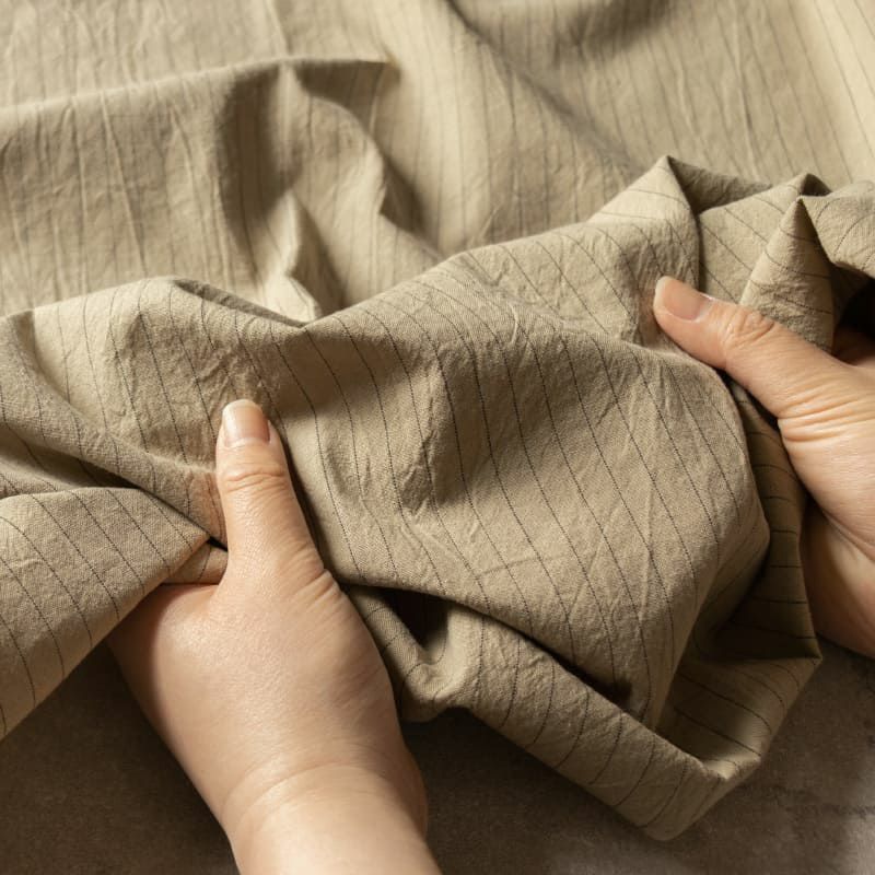 先染め綿麻ペンシルストライプは、綿90%と麻10%の混紡糸を使い、日本国内で平織りのストライプ柄に織られた、中薄地の生地になります。