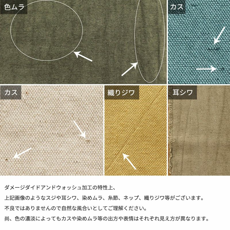 加工上の特性ダメージダイドアンドウォッシュ加工の特性上、上記画像のようなスジや耳シワ、染めムラ、糸節、ネップ、織りジワ等がございます。不良ではありませんので自然な風合いとしてご理解ください。