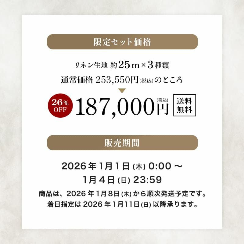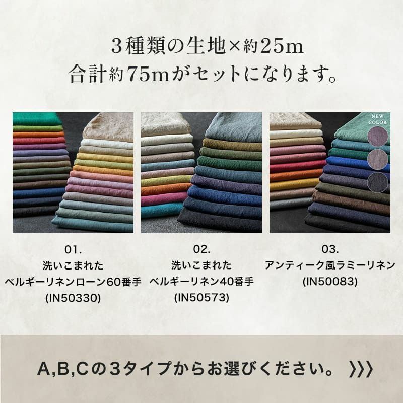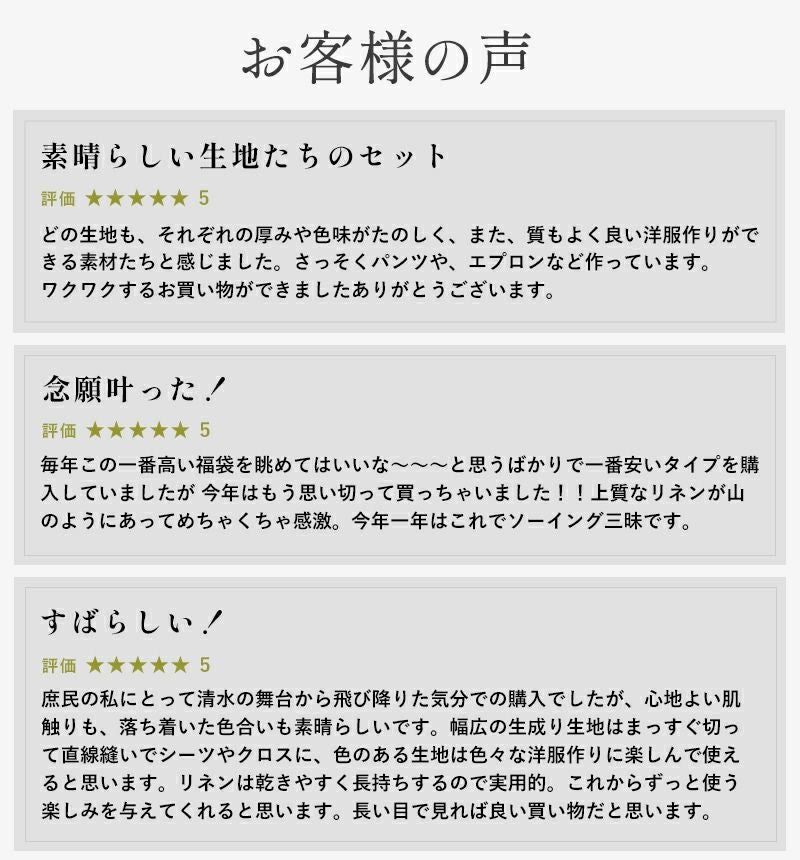 すべて生地の森オリジナルリネンで、通常では手に入らない特別なセット内容を、大変お得な価格でご用意しました。
