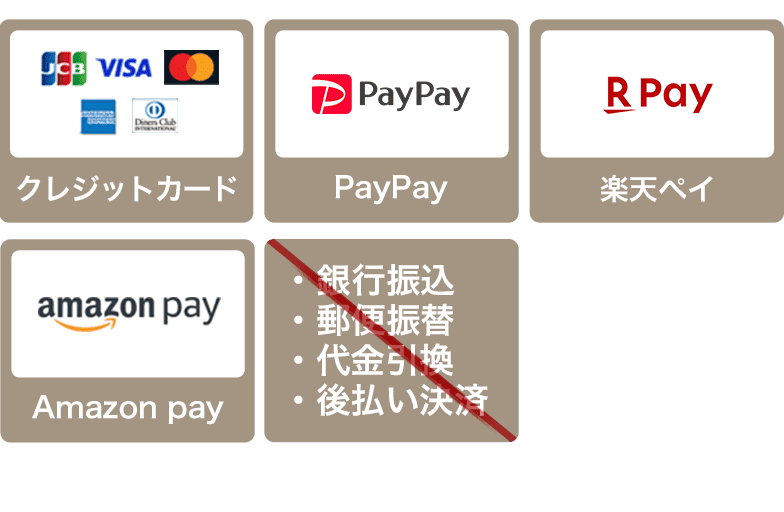 • お支払い方法は、クレジットカード、PayPay、楽天ペイ、Amazon pay、後払い決済 とさせていただきます。