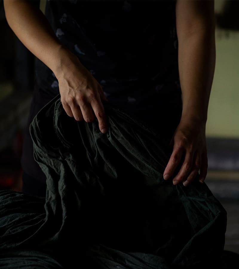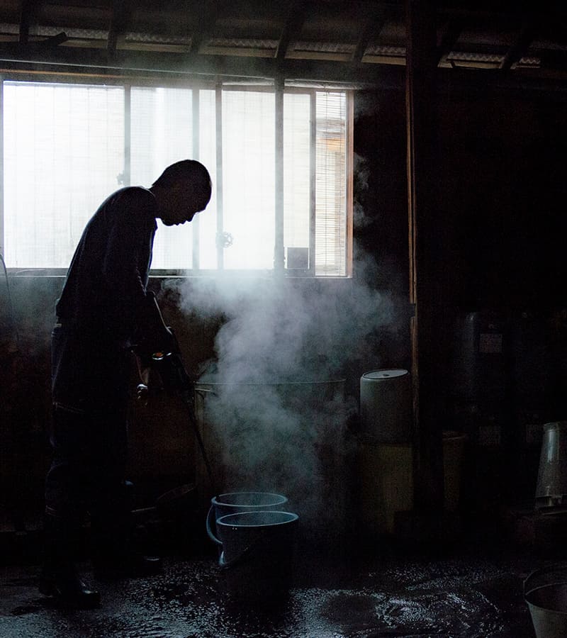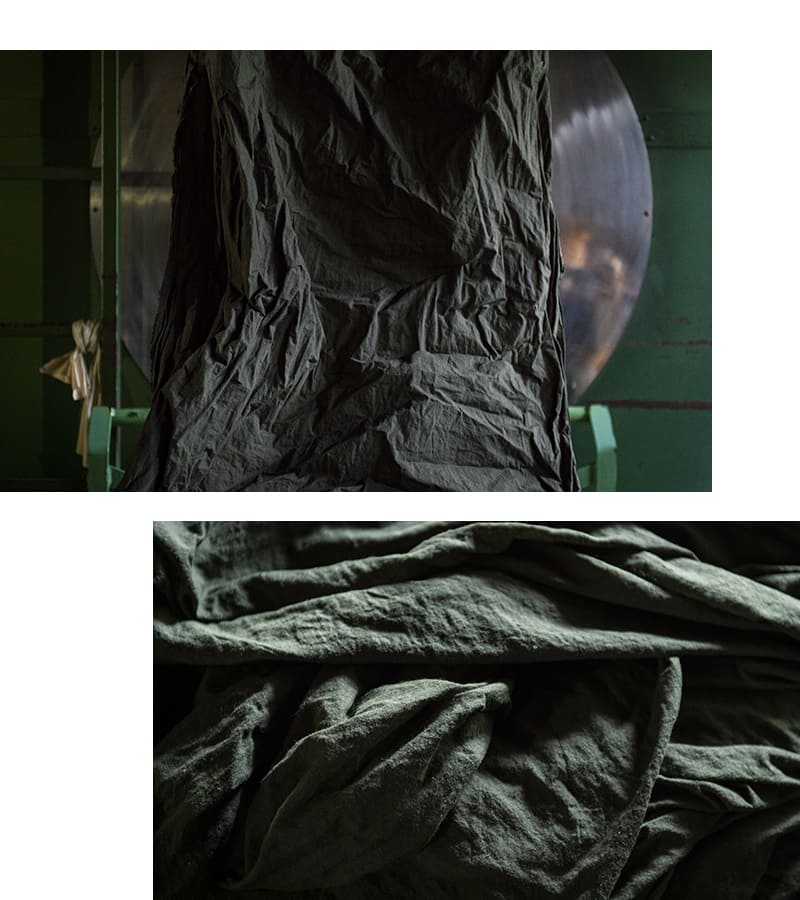 生機(キバタ)を薬品等による下処理を行うことなくダイレクトに染め上げるナチュラルダイド加工を施し、繊細な透け感と洗いこまれた柔らかなシボ感、職人の技が光るカラーが特徴的な雰囲気ある生地です。