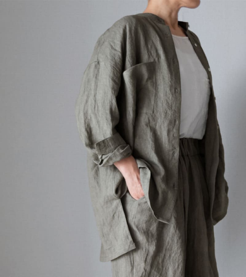 生地の厚さが程よく扱いやすいので、ハンドメイド初心者の方にもおすすめ。シンプルなお洋服も仕立て映えします。使い込むほどに増す風合いを是非お楽しみください。