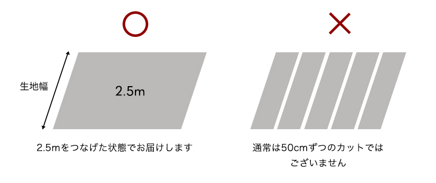 生地幅(ヨコ幅)を半分にしたり、「50cm×50cm」「70cm×30cm」などの特定のサイズや細かなカット指示はご遠慮ください。
