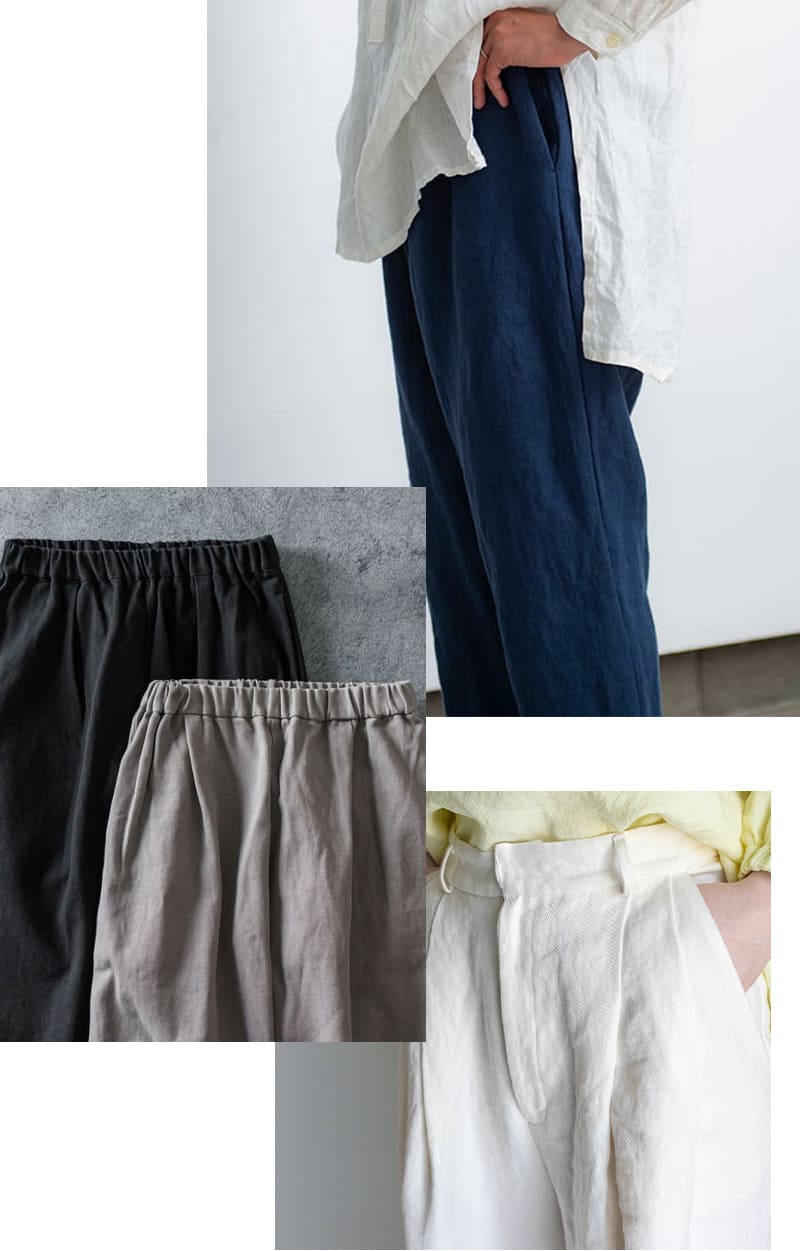 張り感と柔らかさを兼ね備えたツイル生地。パンツや羽織りに、品ある大人のリネンスタイルを。