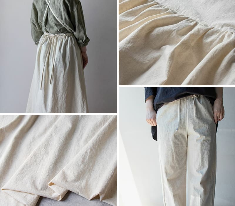ハリとやわらかさがちょうどいい。国内で織布・加工された、コットンリネンの国産ライトウェザークロス。天然繊維ならではの素朴な風合いと、ほどよいハリ感をあわせ持ち、衣類や雑貨づくりにも幅広く活躍します。