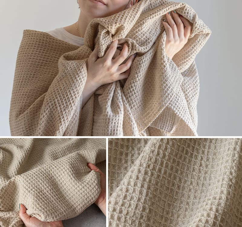 ふわっ、もちっ、さらっ。変化が楽しい。立体感のある大きなワッフル織りが、触れるたび心地よい。